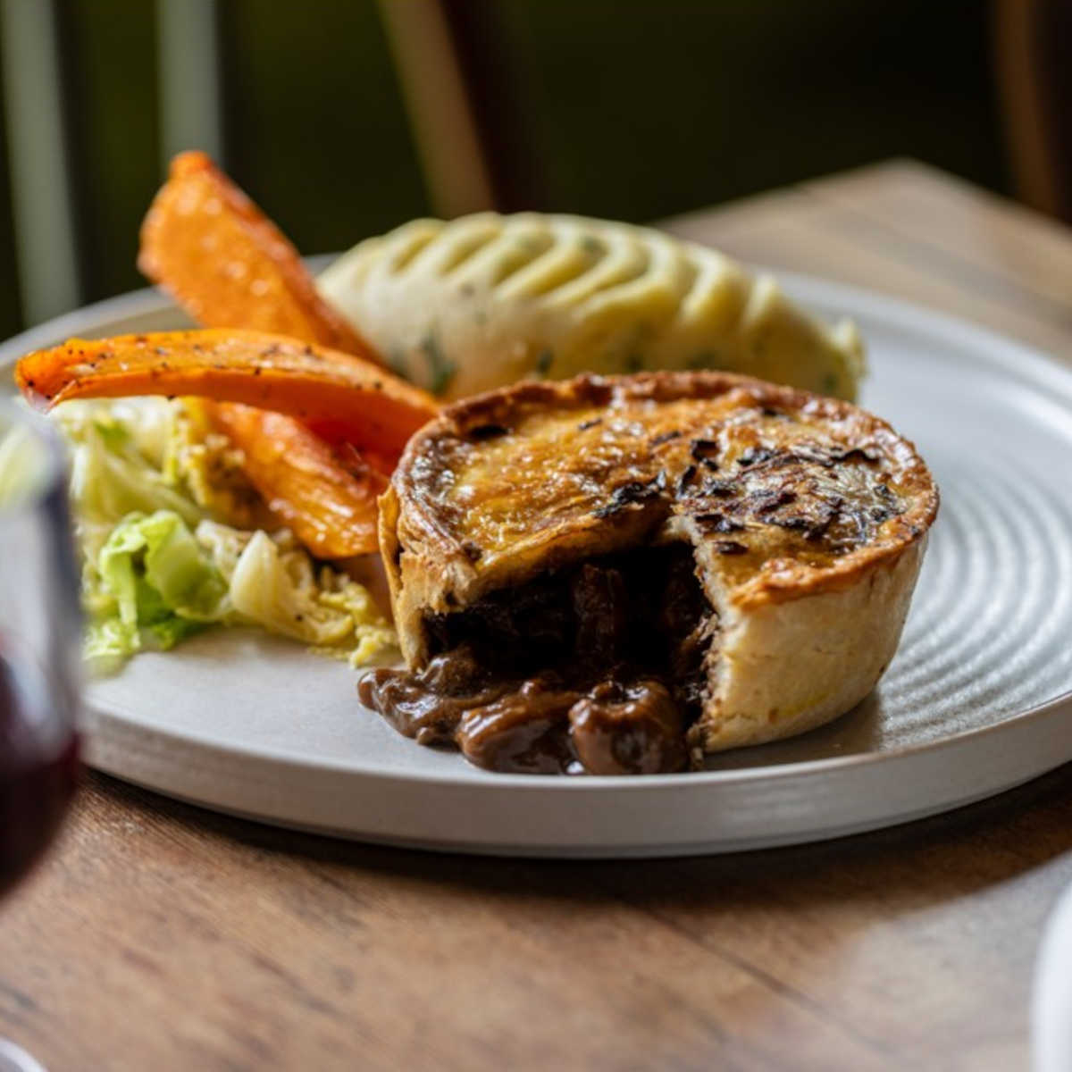 Wild mushroom bourguignon pie, skin-on chips, cabbage, roasted carrots (ve) | 14.50 1515 kcals